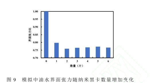 圖9模擬中油水界面張力隨納米黑卡數(shù)量增加變化