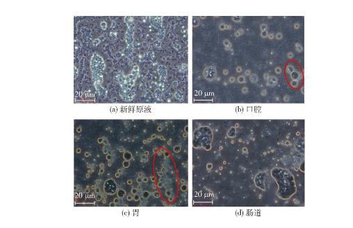圖7是通過光學(xué)顯微鏡拍攝的模擬消化后各階段乳液的形態(tài)。圖7(a)顯示,消化前乳液粒徑大小適宜且分布密集,其中高亮處的乳液粒徑較大,此時(shí)乳液具有良好的穩(wěn)定性;圖7(b)顯示,經(jīng)口腔模擬消化后的乳液分布較為稀疏,但仍存在W1/O/W2雙重乳液結(jié)構(gòu);觀察圖7(c),經(jīng)模擬胃消化后的乳液整體粒徑較大且分布相較于圖7(b)密集,同時(shí)觀察到中小液滴高密度堆積成帶,說明在強(qiáng)酸和胃蛋白酶存在下,雙重乳液傾向于聚結(jié)在一起,這一結(jié)果增加了液滴間的聚集率,進(jìn)而導(dǎo)致乳液粒徑增大;圖7(d)結(jié)果顯示,經(jīng)模擬腸道消化后的乳液失去原有的多相結(jié)構(gòu),高度聚結(jié)后的乳液破裂后釋放出W1/O型液滴,又堆積形成大小、形狀不一的大液滴,部分微粒粒徑增大到5 600 nm,而油相經(jīng)膽鹽的乳化作用進(jìn)一步會形成更小的油滴。實(shí)驗(yàn)結(jié)果表明,經(jīng)模擬口腔、胃消化后的乳液仍具有良好的雙重乳液結(jié)構(gòu),而乳液由于聚集作用,粒徑逐漸增大,最終在模擬腸道消化階段,雙重乳液結(jié)構(gòu)破壞,釋放出的W1/O型乳液在胰酶的作用下分解并釋放出LOPs。