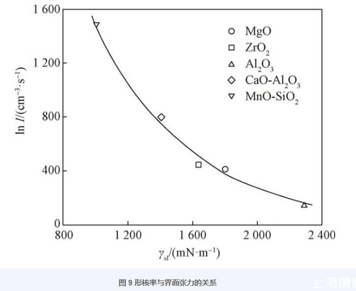 夾雜物的形核與夾雜物和鋼液間的界面張力有關(guān),式(7)~式(9)為關(guān)于界面張力的函數(shù)。可知,夾雜物與鋼液間的界面張力降低,臨界過飽和度S*降低,夾雜物的形核率升高。