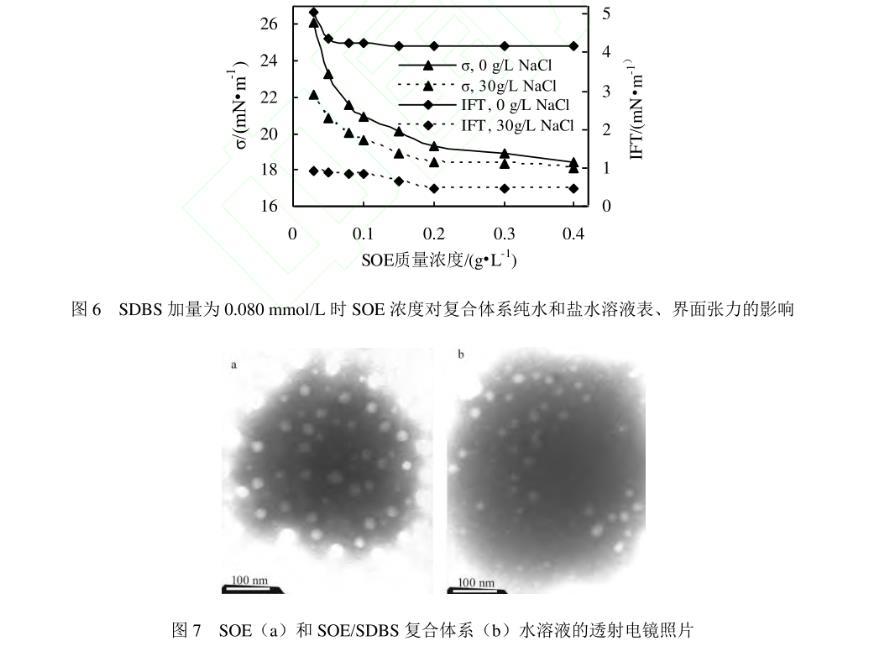測試發現十二烷基苯磺酸鈉(SDBS)在純水溶液中的ccmc為0.5 mmol/L(0.174 g/L),該濃度下溶液的表、界面張力分別為27.06 mN/m和0.18 mN/m;SDBS在30 g/L NaCl溶液中的ccmc為0.080 mmol/L(0.028 g/L),該濃度下溶液的表、界面張力分別為27.62 mN/m和0.21 mN/m。因此,選擇與SOE復合的SDBS的濃度為0.08 mmol/L。