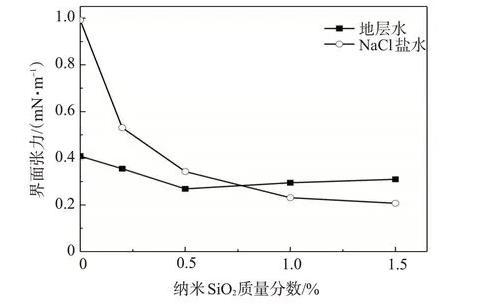 在NaCl鹽水中,納米SiO2/SDS體系的|ζ|基本大于30 mV,體系更易穩(wěn)定;模擬地層水中二價陽離子的存在使得體系的|ζ|均小于30 mV,顆粒容易聚集沉淀。納米SiO2含量越大,顆粒之間碰撞的機率增加,納米SiO2/SDS體系的穩(wěn)定性越差。隨著納米SiO2含量的增加,SDS降低油水界面張力的能力在NaCl鹽水中逐漸增強,而在模擬地層水中先增后減,在SiO2質(zhì)量分?jǐn)?shù)為0.5%時界面張力達(dá)到最低。