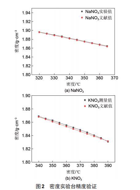 本實驗采用去離子水作為已知液體,由式(3)得到重錘的體積為2.4388~cm^3。對重錘體積進行標定后,通過對KNO3、NaNO3的密度進行測量,驗證實驗臺精度,兩種熔融鹽的密度測量結果與文獻中的密度進行比較。