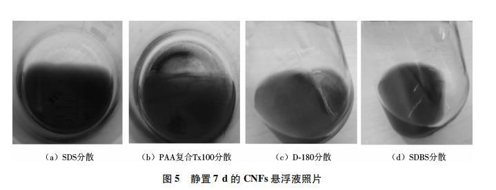 圖5為靜置7d后4種表面活性劑分散的CNFs懸浮液的狀態(tài).可以看出,采用SDS分散的CNFs懸浮液中未見(jiàn)明顯沉淀,SDBS分散的懸浮液中稍有沉淀,PAA復(fù)合Tx100分散的懸浮液和D-180分散的懸浮液中均能觀(guān)察到明顯的黑色沉淀物.