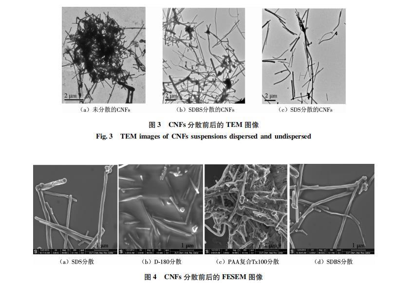 (2)TEM下觀(guān)察SDS與SDBS分散的CNFs懸浮液,可以看到CNFs纏結(jié)現(xiàn)象明顯得到改善,可觀(guān)察到單根CNF存在,SDS對(duì)CNFs的分散效果強(qiáng)于SDBS.