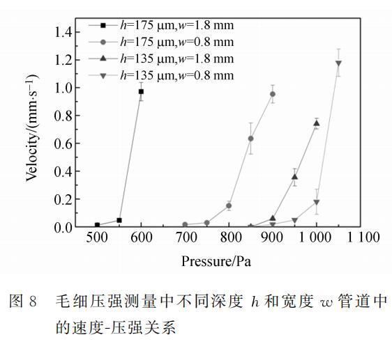 PDMS微管道采用軟光刻工藝制作。PDMS結構層從模具揭下后,倒過來粘接在基底上,管道裸露朝上,形成開放管道。然后用壓敏膠(ARclad IS-7876,Adhesives Research.Inc.)將棚網粘接到開放管道上。制作的微管道寬分別為0.8~mm和1.8~mm,深75mu m和115mu m,長3cm和4cm。壓敏膠厚約60mu m,最終得到的開放管道高度約135μm和175μm。