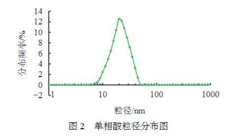 采用激光粒度分析儀對單相酸粒徑及分布進行了測定,實驗結果見圖2??芍獑蜗嗨崃酱笮》植荚?~50 nm范圍之內,分布較窄,為高斯分布,在單相微乳粒徑范圍內。