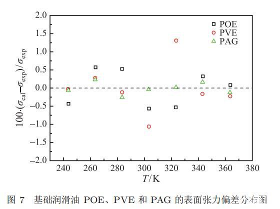 式中,T 是溫度,K;σ 是表面張力,mN·m?1;a、b 和 c 為關(guān)聯(lián)方程的擬合參數(shù)?;A潤滑油 POE、PVE 和 PAG 的參數(shù)關(guān)聯(lián)值和絕對平均偏差列于表 4 中,其實驗數(shù)據(jù)與關(guān)聯(lián)方程的絕對平均偏差分別為 0.43%、0.45% 和 0.13%;三種基礎潤滑油的相對偏差分布如圖 7 所示,其實驗測量結(jié)果的相對偏差均在 ±1.5% 以內(nèi),表明實驗結(jié)果與關(guān)聯(lián)方程的吻合良好。