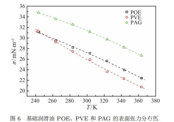 實驗測量了 POE、PVE 和 PAG 三種基礎潤滑油在常壓環(huán)境的表面張力,其溫度范圍為 243.15 ~ 363.15 K,實驗測量結(jié)果如表 3 所示。鑒于基礎潤滑油的飽和蒸汽壓非常低,需要在實驗裝置內(nèi)充入一定壓力氣體來確保懸垂液滴的穩(wěn)定形成,充入的氣體應不易溶于基礎潤滑油且低溫環(huán)境不會在玻璃觀察窗形成凝結(jié)液膜,因此在實驗測量過程中裝置內(nèi)部充入 0.1 MPa 左右的氮氣。根據(jù)相應的實驗環(huán)境,表面張力測量所需的密度差 ?ρ 應為基礎潤滑油的液相密度減去氮氣的氣相密度,氮氣的氣相密度由 Refprop 軟件計算獲得。三種基礎潤滑油的表面張力隨溫度的變化趨勢如圖 6 所示,表面張力隨著溫度的增大而降低,在同一溫度條件下,PAG 表面張力最大,POE 次之,PVE 最小;但在 243.15 K 以下區(qū)域,PVE 的表面張力要大于 POE。
