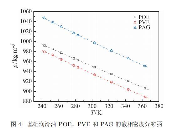 基礎潤滑油的液相密度是開展表面張力實驗研究的基礎數(shù)據(jù),本文采用安東帕 DMA5000M 振動管密度計測量了 POE、PVE 和 PAG 三種基礎潤滑油在常壓環(huán)境下的液相密度,溫度范圍為 278.15 ~ 363.15 K。鑒于振動管密度計的測量溫度范圍有限,三種基礎潤滑油在低溫環(huán)境下的液相密度使用比重瓶法進行測量,溫度范圍為 243.15 ~ 278.15 K,其實驗測量結(jié)果如表 1 所示。