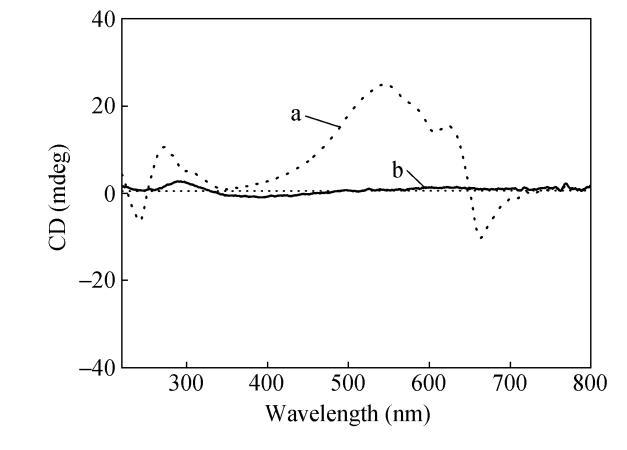 香豆素基團(tuán)在紫外光照條件下可發(fā)生可逆的光二聚反應(yīng):在365nm光輻照下,香豆素基團(tuán)能發(fā)生光二聚反應(yīng),在254nm輻照下香豆素二聚體能可逆地發(fā)生解二聚反應(yīng)。可以預(yù)見香豆素端基的二聚化將影響香豆素取代二乙炔單體在氣液界面的組裝,從而影響聚二乙炔主鏈螺旋結(jié)構(gòu)的形成。我們用365nm紫外燈輻照CODA氯仿溶液20min,此時(shí)香豆素端基能發(fā)生二聚,而二乙炔基團(tuán)不會(huì)發(fā)生聚合。將得到的CODA二聚體的氯仿溶液鋪展在水面上,沉積制備LB膜,制備得到的CODA二聚體LB膜能聚合成藍(lán)相。CD光譜測(cè)試發(fā)現(xiàn)香豆素基團(tuán)和相應(yīng)的聚二乙炔吸收帶均出現(xiàn)了明顯的CD信號(hào),但強(qiáng)度較CODA LB膜均有所減弱,如圖8所示。