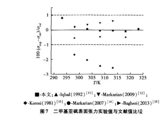 圖7 二甲基亞砜表面張力實驗值擬合得到的方程與文獻(xiàn)實驗值的偏差