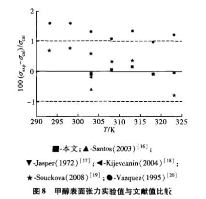 圖8為甲醇表面張力實驗值擬合得到的方程與文獻(xiàn)實驗值的偏差,本文數(shù)據(jù)與Santos等[15],Jasper[16],Kijevcanin等[17]和Souckova等[18]數(shù)據(jù)吻合得較好,與Vazquez等[19]數(shù)據(jù)偏差稍大,最大偏差為1.6%。