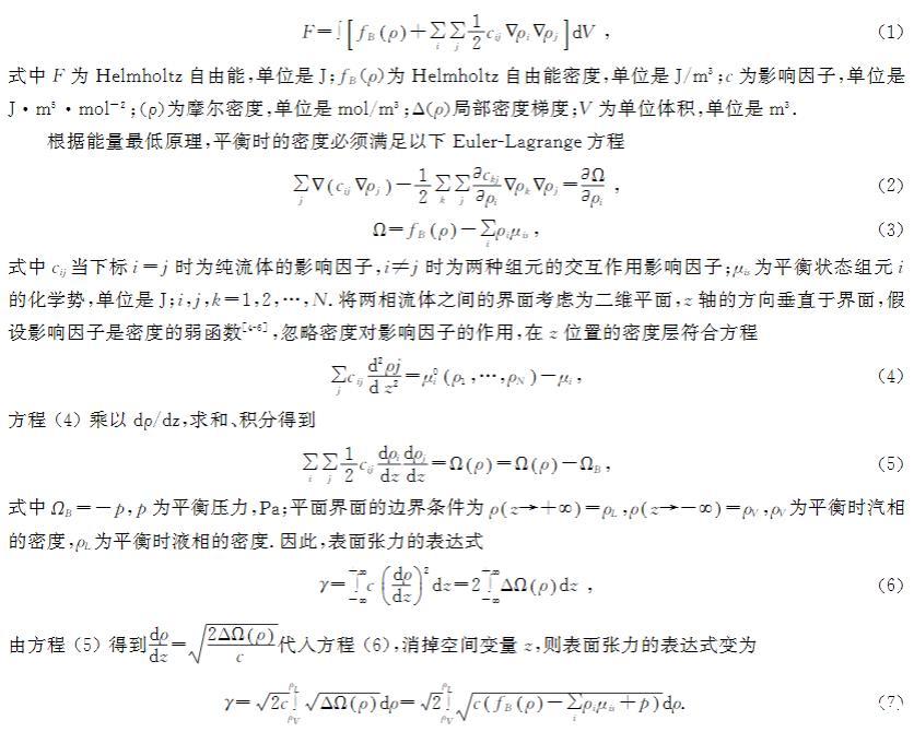 vanderWaals首先提出了密度梯度理論,并將該理論用于氣液界面,通過對氣液界面的研究得出結論,界面處的密度變化是連續(xù)的,后來該理論被Cahn和Hilliard完善。該理論中,界面的Helmholtz自由能密度為兩部分的加和:均相部分和非均相部分。Helmholtz自由能密度Taylor級數的二階展開式為