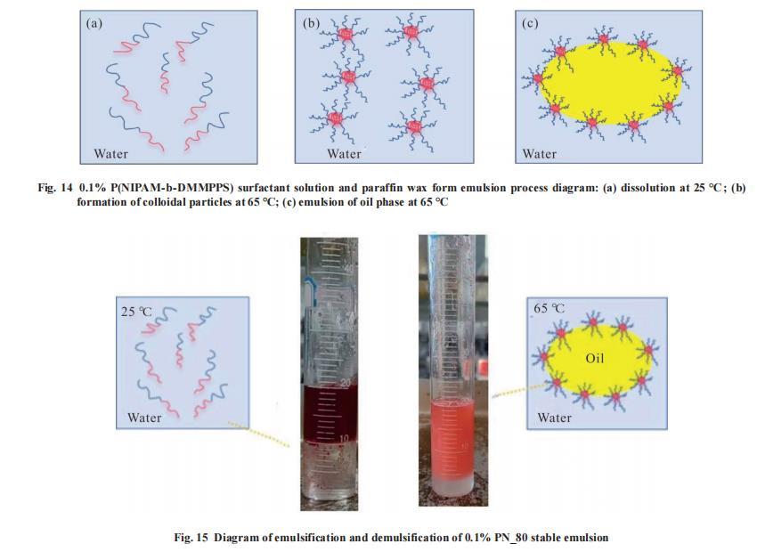 Fig.14展示了P(NIPAM-b-DMMPPS)形成乳液的機理圖,在25°C時,P(NIPAM-b-DMMPPS)雙嵌段聚合物的PNIPAM鏈段和PDMMPPS鏈段都處于親水狀態并且舒展開來,使得其能夠溶解在水中。因為在這個溫度時,PNIPAM鏈段的酰胺基與水分子之間形成了氫鍵,表現出親水性,而PDMMPPS鏈段親水性強,能與水分子相互作用,使整個聚合物分子充分溶解。當溫度升高到65°C時,PNIPAM鏈段的氫鍵在高溫時被破壞,導致其變得疏水并發生收縮;與此同時,PDMMPPS鏈段依然保持親水性并舒展開來。這種不同的溫度響應性質使得P(NIPAM-b-DMMPPS)聚合物在水溶液中形成了以疏水的PNIPAM為核,親水的PDMMPPS為殼的微米級球狀膠體顆粒。在這種結構形態下,當表面活性劑(即這種雙嵌段聚合物)與油混合并進行乳化時,疏水的PNIPAM核可以與油相容,而親水的PDMMPPS殼則可以與水相容,從而穩定地分散在連續水相中。這樣,就形成了穩定的乳液。
