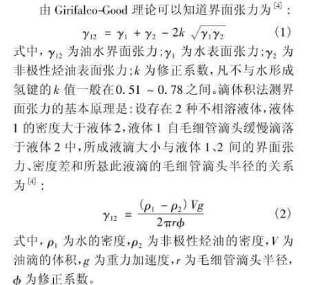 式中,γ??為油水界面張力;γ?為水表面張力;γ?為非極性烴油表面張力;k為修正系數(shù),水不與水形成氫鍵的k值一般在0.51~0.78之間。滴體積法測(cè)界面張力的基本原理是:設(shè)存在2種不相溶液體,液體1的密度大于液體2,液體1自毛細(xì)管滴頭緩慢滴落于液體2中,所成液滴大小與液體1、2間的界面張力、密度差和所懸此液滴的毛細(xì)管滴頭半徑的關(guān)系為: