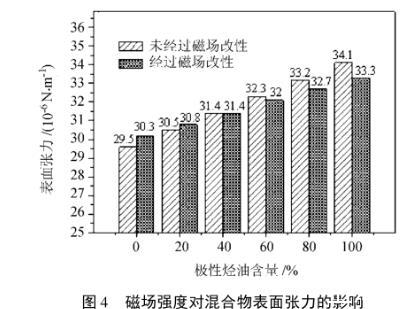 2)經(jīng)過(guò)磁場(chǎng)改性后,極性烴油的表面張力會(huì)降低。