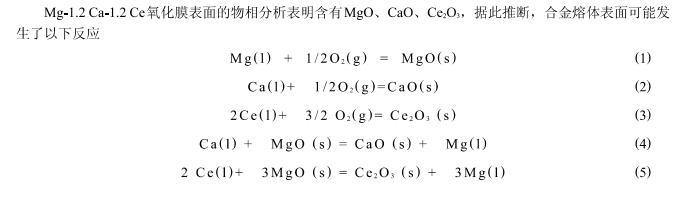這種氧化膜結(jié)構(gòu)的明顯不同可以很好的解釋阻燃效果之間的差異.歸其原因,主要是由于,在沒有添加任何Ce元素的情況下,不論形成的MgO薄膜還是CaO薄膜,由于其致密度較低,因此不能夠完全阻止氧的進一步擴散;相反,在添加了較多元素的Ce后,不但可以形成更加致密的復(fù)合的氧化膜,而且Ce2O3比較致密,不但可以很好的隔絕氧的進一步擴散,而且還能夠添補許多裂紋,因此,具有很好的阻燃效果.
