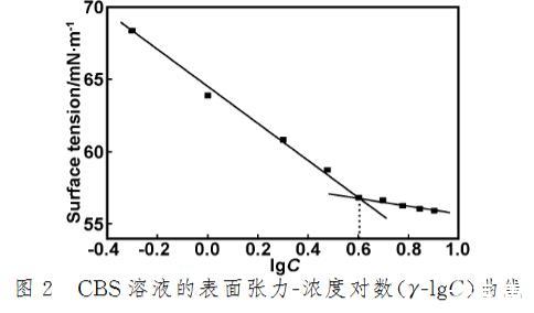 (1)CBS溶液的表面張力隨濃度的增大而降低,最后趨于平緩,此時表面張力為55.92 mN/m,并得出其臨界膠束濃度為4.0×10^-3 mg/mL。