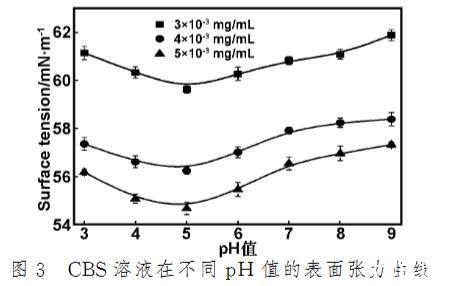 (2)CBS溶液的表面張力隨pH的增大呈現先降低而后增加的趨勢,在等電點附近表面張力最小。