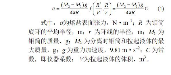式中,σ為熔鹽表面張力,N·m?1;R為鉬筒底環的平均半徑,m;r為環線的半徑,m;M1為鉬筒的質量,g;M2為分離時鉬筒和拉起液體的最大質量,g;g為重力加速度,9.81 m·s?2;C為常數,即儀器系數;V為拉起液體的體積,m3。