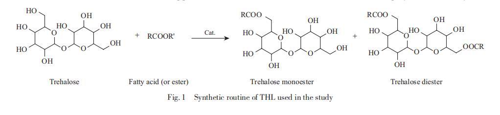 海藻糖脂(THL)是一種含有海藻糖親水部分的糖脂,可以降低界面張力并增加疏水化合物的假溶解度。海藻糖脂具有多樣的結構特征,并已用于各種工業應用,例如農業中的生物農藥,以及食品工業中的乳化劑和防腐劑。海藻糖脂在清潔、乳化、發泡、抗菌活性方面的多功能特性,使其在化妝品中具有多種應用潛力。作為糖脂表面活性劑,海藻糖脂由多種微生物產生,其疏水區域表現出從短鏈到長鏈和復雜脂肪酸鏈的多種結構。生物合成產率低是生物表面活性劑的常見問題,這阻礙了其大規模生產。目前,通過化學合成制備的具有簡單結構的海藻糖脂是生產的更好選擇,本研究中使用的海藻糖脂的合成路線如圖1所示。本研究中使用的海藻糖脂由綠色原料(淀粉、棕櫚油等)通過脂肪酸酯和海藻糖之間的酯交換反應制成,利用來自淀粉的葡萄糖和從棕櫚油提取中獲得的脂肪酸(酯)。