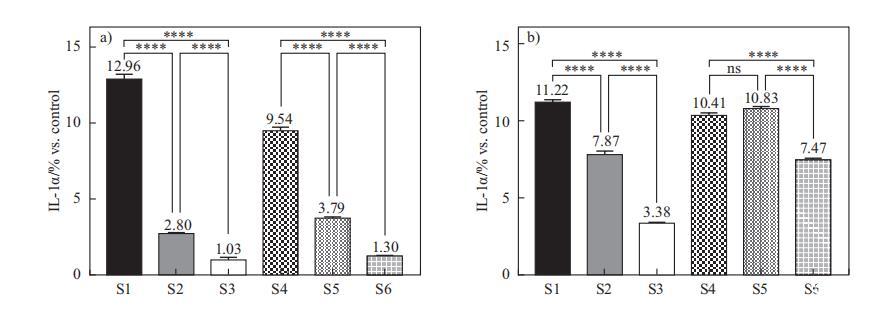 IL-1a值是從用稀釋的表面活性劑復合物S1-S6(濃度為0.015%和0.020%)處理24小時后收集的上清液進行分析的。選擇的處理濃度是細胞仍然存活,同時可以觀察到IL-1a釋放差異的濃度(數(shù)據(jù)未顯示)。IL-1a值與未經(jīng)任何處理的對照樣品校準后進行比較。如圖4所示,在表面活性劑復合物中加入海藻糖脂(S3和S6)可顯著減少二元體系S1和S4的細胞因子釋放。但在SMCT/CAPB體系中加入DG(S4 vs S5)在0.02%時并未抑制IL-1a釋放。此外,海藻糖脂比DG更能降低IL-1a釋放,且差異顯著(S3 vs S2,S6 vs S5)。在濃度效應方面,它對三元體系(S2-S3,S5-S6)影響更大,意味著非離子表面活性劑可以在較低濃度下進一步抵消離子表面活性劑對IL-1a的刺激。