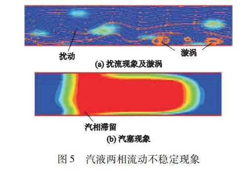 圖4中汽液兩相速度分布不均的原因:汽泡與通道尺寸在同一量級,汽泡對流動擾動增強,且隨著汽泡的急劇生長,當汽泡大小達到微通道尺寸,汽泡堵塞通道,阻礙汽液兩相的正常流動,即發生汽塞現象。汽液兩相流動不穩定現象如圖5所示。