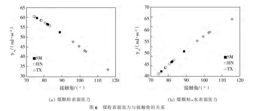 式(6)、(7)即為在無限界面體系中液-固界面與固體表面的表面張力計算式。這種方法計算得到的表面張力是未加任何假設條件的理論解。由式(6)、(7)可得,通過實驗測量接觸角θ(如圖3、4中的θ1、θ2)與液相的表面張力即可求得液-固界面與固體表面的表面張力。計算結果見圖5,其中γlg=72.75 mJ/m2。由圖可知,與太西煤相比,神木煤和淮南煤有較大的表面張力,隨著變質程度的增加,煤顆粒的表面張力減小。超細粉碎后的γsg與接觸角呈負相關,γsl與接觸角呈正相關。3種煤樣的表面張力、煤-水界面張力與接觸角的關系見圖6。隨著水在煤表面的接觸角的增加,煤顆粒的表面張力減小,煤-水界面張力增大,潤濕性劣化。煤粉表面張力越小,煤粉-水界面的表面張力越大,在與氣泡接近過程中,更易于排開表面的水分子,與氣泡接觸。