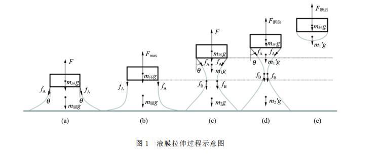 此時的液膜m1′將停留在吊環(huán)上,如圖1(e)所示。所以拉斷后,吊環(huán)所受拉力為吊環(huán)重力與殘留液膜重力之和。