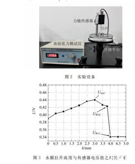 圖2是WBM-1A拉脫法液體表面張力實驗儀,用來測定純凈水的表面張力系數(shù)。實驗時采用標(biāo)準(zhǔn)吊環(huán)的內(nèi)、外徑分別為d1=33.10 mm,d2=34.96 mm,平均直徑為d?=34.03 mm,平均周長為πd?=106.88 mm。該標(biāo)準(zhǔn)環(huán)拉出的水膜高度與力敏傳感器電壓讀數(shù)之間的關(guān)系,如圖3所示??梢钥闯觯S著水膜高度的增加,吊環(huán)拉力逐漸增加到最大(圖中Umax表示),然后慢慢減小,直至水膜斷裂。圖中U斷前和U斷后分別表示水膜斷裂時和斷裂后的瞬時電壓值。吊環(huán)的受力變化情況與之前理論分析一致。