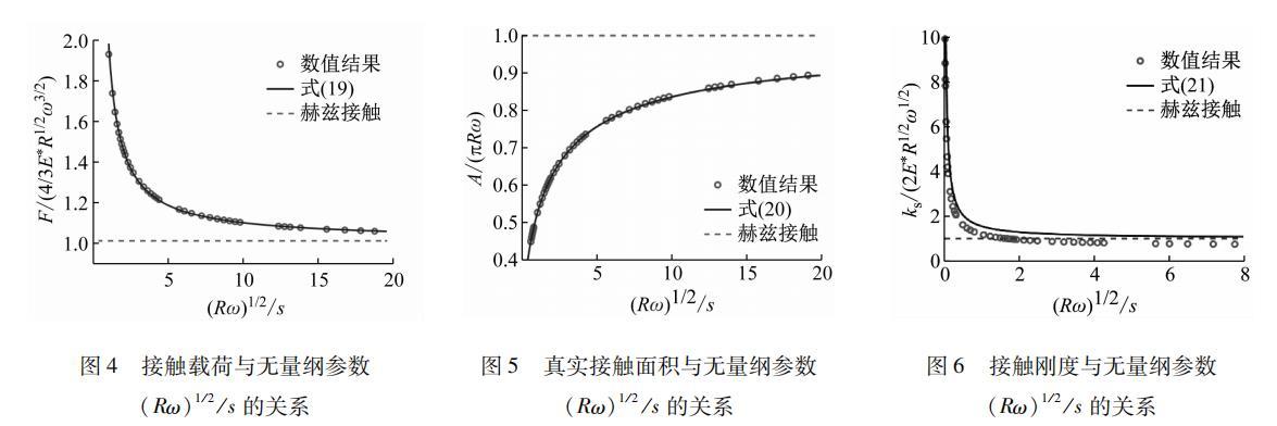 實際工程中不同粗糙表面對應的微凸體曲率半徑各不相同,在上述的數(shù)值求解過程中,以微凸體曲率半徑R=10 mm為例來研究表面張力對接觸特性的影響,其他參數(shù)G=1 MPa, μ=0.4, β=0.1 J/m2。獲得了無量綱接觸載荷F/(4/3 E* R1/2 ω3/2)和無量綱接觸面積A/πRω與無量綱參數(shù)(Rω)1/2/s的數(shù)值關系,通過對數(shù)值解的擬合,得到了考慮表面張力時載荷F和真實接觸面積A與壓入深度ω的關系式分別如式(19)和式(20)所示,且不同的R值只會影響式(19)和式(20)中的擬合系數(shù)。