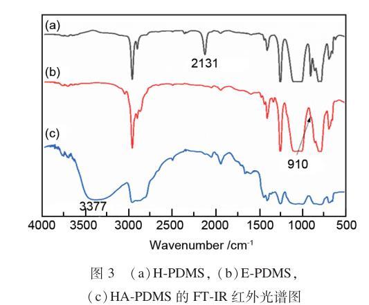 圖3為產(chǎn)物的紅外光譜圖。通過圖3(a)與(b)對(duì)比可以看出,圖3(a)中2127cm-1處硅氫鍵的伸縮振動(dòng)峰在圖3(b)中消失,表明環(huán)氧基團(tuán)成功連接到H-PDMS兩端。通過圖3(b)與(c)對(duì)比可以看出,圖3(b)中910cm-1處環(huán)氧基的伸縮振動(dòng)峰在圖3(c)中消失,并出現(xiàn)3377cm-1處羥基的伸縮振動(dòng)峰,表明二乙醇胺已將環(huán)氧基團(tuán)開環(huán),成功制備了HA-PDMS。