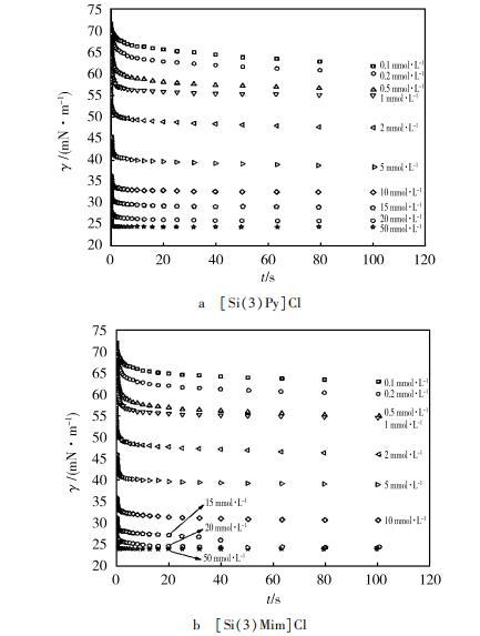 分別配制不同濃度的[Si(3)Py]Cl和[Si(3)Mim]Cl水溶液,25℃在芬蘭Kibron公司生產的Delta-8全自動高通量表面張力儀上測定10 ms~100 s的動態表面張力。