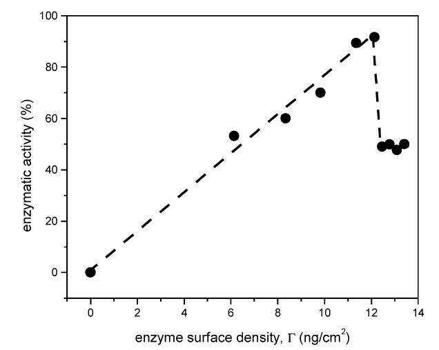 在5到18 mN/m的表面壓力下,DMPA的表面密度從1.45×1017分子/m2變化到2.30×1017分子/m2。 考慮到DMPA和DSAP都保留在界面上,單層的壓縮應(yīng)減少磷脂和蛋白質(zhì)的可用面積。 因此,可以估計(jì)酶的表面密度,并將其與酶活性關(guān)聯(lián)起來(lái)(圖2)。 高達(dá)12.1 ng/cm2(對(duì)應(yīng)于18 mN/m的表面壓力)時(shí),觀察到線性相關(guān)性,表明活性的增加直接反映了酶表面密度的增加。 然而,當(dāng)?shù)鞍踪|(zhì)表面密度高于12.1 ng/cm2時(shí),酶活性會(huì)突然下降。