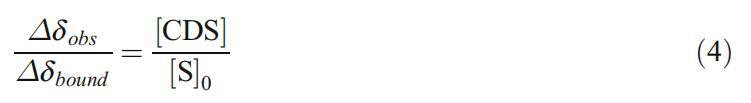 在任何給定的α-環糊精濃度下,結合表面活性劑分子的分數都可以通過其信號的化學位移來確定。客體分子在束縛態(δ束縛態)和自由態(δ自由態)有不同的化學位移。在自由形式和束縛形式之間的平衡以及這兩種狀態之間的交換率(比共振頻率差快)的情況下,將僅觀察到一個具有觀測到的化學位移(δobs)的信號,即δ束縛和δ自由之間的加權平均數。對于以下內容,我們定義了觀察到的化學位移變化(?δobs)和結合時化學位移的變化(?δ界):