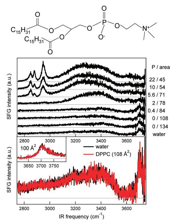 圖1。頂板:DPPC的分子結(jié)構(gòu)。中間面板:裸露水面(底部光譜)和密度增加的水中DPPC的SSP極化SFG光譜。壓力(mN/m)和每個(gè)分子的面積(?2)分別從底部到頂部增加和減少,在圖表旁邊給出。每個(gè)分子的面積由氯仿溶液滴的數(shù)量控制。CH(2800)?3000厘米?1),氫鍵OH(3000?3600厘米?1),還有免費(fèi)的哦(~3705厘米?1)拉伸振動(dòng)可見。底部面板:從裸露水面的中間面板放大,每個(gè)分子的DPPC為108?2,以表明它們的相似性。插圖放大了裸露水面和DPPC(100?2)表面的自由OH拉伸振動(dòng)區(qū)域。在每個(gè)分子的這個(gè)區(qū)域,壓力仍然低于檢測(cè)極限,表面上DPPC的存在顯然不影響自由OH拉伸振動(dòng)的振幅。相對(duì)較高的紅外通量(~10 mJ/cm2)用于本實(shí)驗(yàn)。