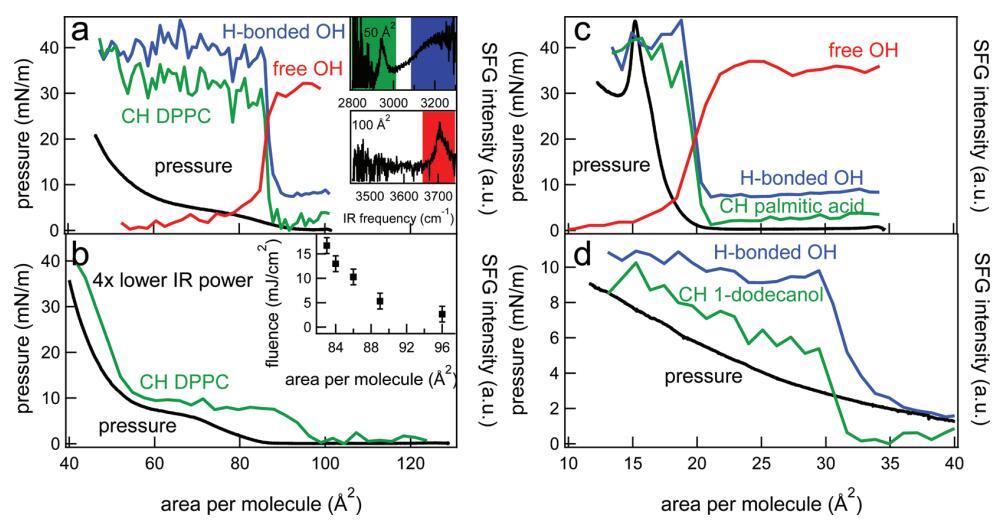 圖2。(a)DPPC的CH信號(hào)(綠色)、氫鍵OH信號(hào)(藍(lán)色)和自由OH信號(hào)(紅色)的表面壓力(黑色,左軸)和積分SFG強(qiáng)度(右軸),作為連續(xù)壓縮單層過程中每個(gè)分子面積的函數(shù)。為了清晰起見,集成SFG信號(hào)被歸一化,并且彼此之間具有小偏移。集成光譜區(qū)域由插圖中的彩色正方形標(biāo)記,分別顯示CH/OH鍵合和游離OH區(qū)域中每個(gè)分子50和100?2的SFG光譜。相對(duì)較高的紅外通量(~已使用10 mJ/cm2)。(b)與(a)類似,但紅外功率降低了四倍,導(dǎo)致通量降低了四倍(~2.5 mJ/cm2)。插圖顯示了改變紅外注量對(duì)SFG信號(hào)出現(xiàn)的每個(gè)分子面積的影響。(c)類似于(a),但適用于棕櫚酸。(d)類似于(a),但對(duì)于1-十二醇。在這種情況下,未測(cè)量1-十二醇的游離OH。SFG結(jié)果是在SSP極化下獲得的。