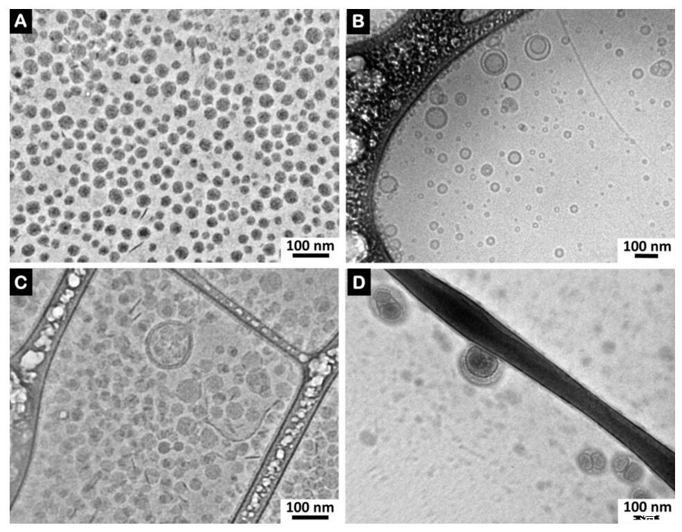 圖7。(A)低密度脂蛋白,(B)脂質體,(C)低密度脂蛋白和精漿(精漿中的比例為0.17 mg PC/mg BSP蛋白質)和(D)脂質體和精漿(精漿中的比例為0.16 mg PC脂質體/mg BSP蛋白質)的冷凍電鏡圖像。