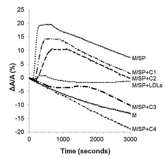 圖5。注入(…)后,由單層(M)覆蓋并在不含(-)額外分子的緩沖液上形成的界面的相對表面積隨時間的變化SP(26.6±1.5 mg蛋白質)、SP(26.6±1.5 mg蛋白質)和不同濃度(··-)C1、(·-)C2的脂質體的混合物,(·-)C3和(·-)C4(分別為1.17±0.02 mg、2.18±0.02 mg、4.37±0.02 mg和6.55±0.02 mg脂質)和(---)LDL(4.6 mg PC)和SP(26.6±1.5 mg蛋白質)的混合物。氣溫是34度?C在空氣-緩沖器接口處。表面壓力保持在25 mN/m。