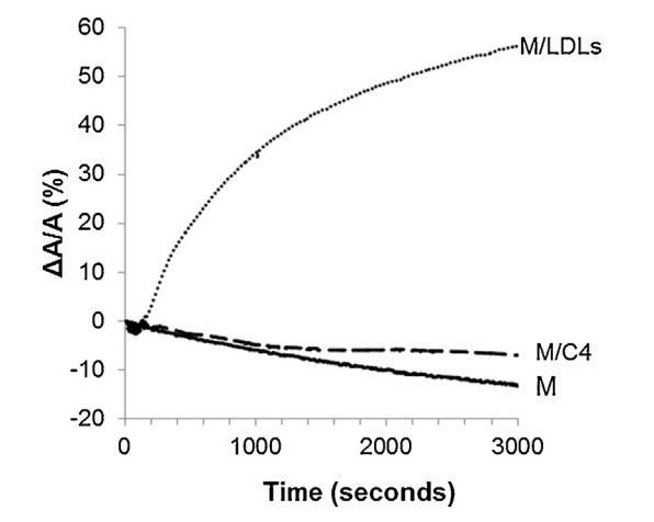 圖4。單層(M)所覆蓋的界面的相對表面積隨時間的變化,該單層(M)以25 mN/M的速度壓縮,并在不含任何額外分子(-)的緩沖液上形成,(…)LDL(4.6 mg PC)和(-)脂質體C4(含4.8 mg PC)。氣溫是34度?C在空氣-緩沖器接口處。