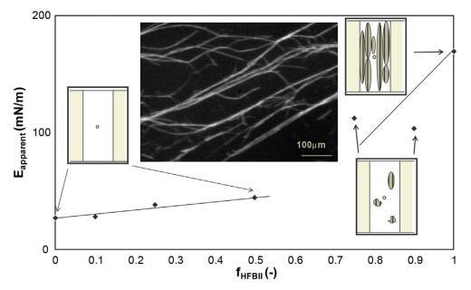 圖2。表觀模量作為擴散層HFBII分數的函數,以及槽屏障之間界面上褶皺斑塊的圖示。右邊是純HFBII層的一個褶皺斑的顯微鏡照片。