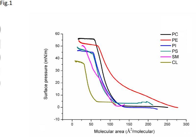 圖1顯示了空氣-水界面上不同磷脂單層的π-A曲線形狀。這里測試的所有磷脂的π-A曲線的形狀都是在所有顯示的表面壓力下單一液體膨脹(LE)和液體冷凝(LC)狀態的特征。在壓縮時,單層經歷了一個轉變,這被視為從LE(低于10 mN/m)到LC狀態的轉變。在高分子區域,由于分子堆積的增加,表面壓力升高,但不改變單層膜的彈性。最后,單分子膜達到了一種更為濃縮的狀態,但在π-a等溫線的形狀中沒有明顯的崩塌點。對于這里測試的磷脂,它們都可以形成穩定的膜,并表現出良好的壓縮性能,DOPC的表面壓力甚至達到57 mN/m。