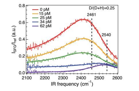 圖5。HOD在H2O中OD拉伸頻率窗口的光譜,給出了在diC14氨基單層下含有增加濃度DNA的磷酸鹽緩沖亞相。HOD的OD拉伸光譜只有一個單峰結構,并且清楚地表明,隨著DNA濃度的增加,共振振幅降低,共振向更高的頻率移動。
