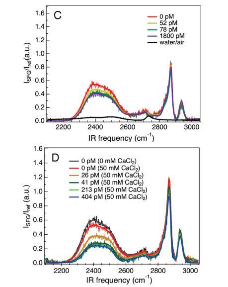 圖2。VSF光譜是OD拉伸區2100-2700 cm-1和CH拉伸區2850-2975 cm-1的DNA濃度的函數。陽離子脂質單分子膜的脂質密度為52?2/分子,兩性離子脂質單分子膜的脂質密度為47?2/分子。A組為DPTAP單層下的VSF光譜,B組為diC14氨基單層下的VSF光譜,C組為DPPC單層下的VSF光譜,D組為含有額外50 mM CaCl2的DPPC單層下的VSF光譜。所有實驗中的亞相都是磷酸鹽緩沖的。每個面板中的單個光譜是具有不同濃度λ-DNA噬菌體的相同系統。每個面板中都顯示了該頻率窗口的磷酸鹽緩沖D2O光譜,以供比較。實體曲線使用公式1擬合數據。