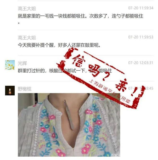 近日,多條“做完核酸檢測身體變磁鐵”的消息在微信群中流傳,有人稱廣東一女子做完核酸檢測一個星期之內,身體吸住了金屬!根據(jù)這些消息,有人稱“以后不要再做核酸檢測了,越做身上‘磁’越多”,甚至有人號召大家拒絕做核酸檢測。