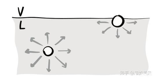 即,對(duì)于體相中的分子,其所受斥力在各方向均等大反向;而對(duì)于位于表面的分子,粒子之間的排斥力從(氣相中的)忽略不計(jì),在經(jīng)過(guò)幾個(gè)分子層后,迅速增加到體相的強(qiáng)度。在這一增加過(guò)程中,由于排斥力的各向同性本質(zhì),其在任一位置的強(qiáng)度在各個(gè)方向是一樣的。