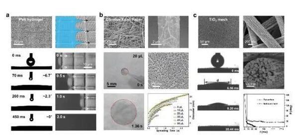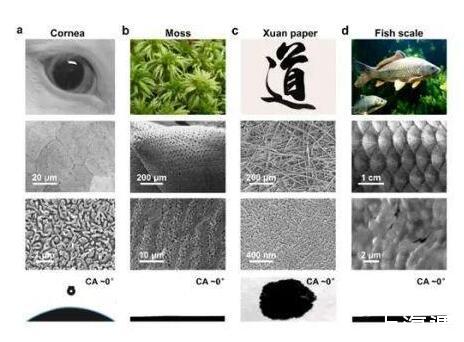文章介紹了經過億萬年進化后自然界中選擇留下的各種優異超鋪展表面,包括動物角膜、宣紙等。自然界中超鋪展表面的優異性能直接決定了其正常作用的發揮甚至其生理功能。這些自然表面均使用了微納復合的多尺度結構來實現超鋪展性能;從分子尺度的表面自組裝水分子結構引起的新的親疏水界線(65°)到納米結構和微觀結構在超鋪展過程中的宏觀各自作用,綜述了超鋪展本質機理研究的最新進展;進一步總結了常用的超鋪展表面制備方法、介紹了超鋪展表面的應用領域,提出了超鋪展體系,總結了該領域存在的挑戰。