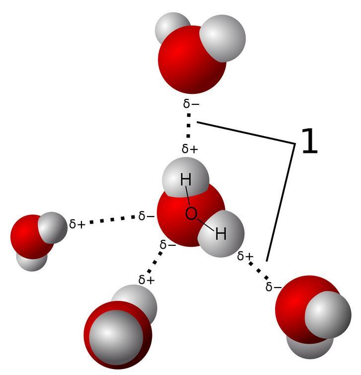 水由氫和氧原子組成。當(dāng)氫(H)原子與氧(O)、氮(N)或氟(F)結(jié)合時,氫唯一的一個電子會與它們形成共價鍵,這時候氫原子的電子由于被O、N或F吸引而稍稍“跑偏”,導(dǎo)致氫原子這一端呈現(xiàn)更多的正電性(氫原子核帶正電);與之相對應(yīng)地,分子的另一端會因?yàn)槲娮拥哪芰Ω鼜?qiáng)而顯示出負(fù)電。分子對外顯示出比較強(qiáng)的電極性,分子與分子之間會因?yàn)殡姌O性的不同而相互吸引。