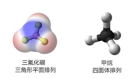 前節(jié)介紹了氯氣分子和二氧化碳分子,它們都是非極性的。對于由更多原子組成的一些分子,由于組合幾何結(jié)構(gòu)的關(guān)系,它們也往往對外顯示出極性或非極性。比如三角形平面排列的三氟化硼和四面體排列的甲烷,它們都是非極性分子,因此不會產(chǎn)生整體偶極子。