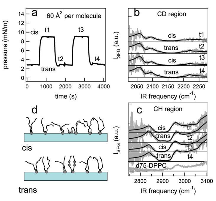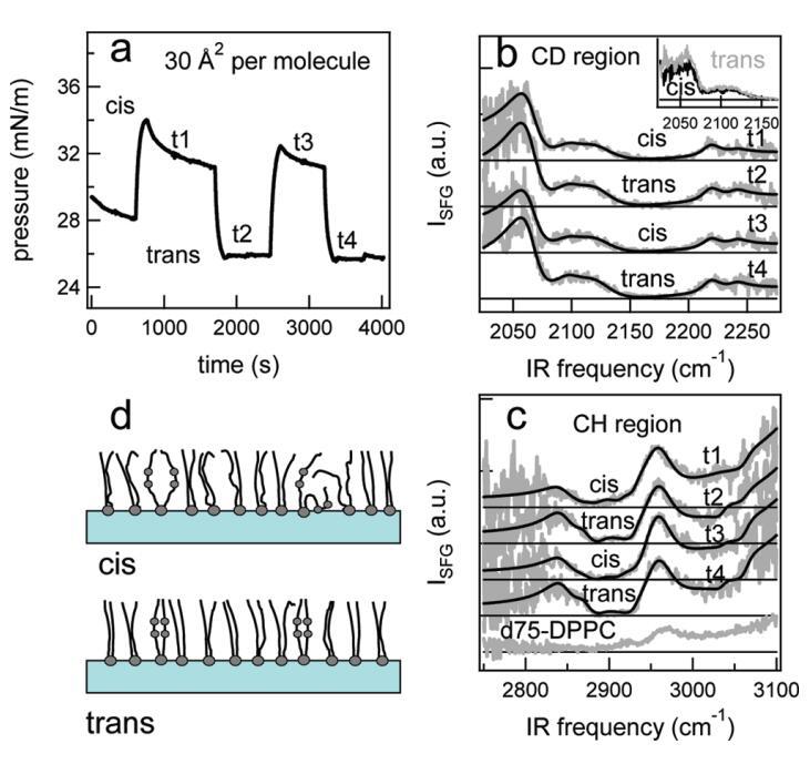 圖6:結(jié)果:DT Azo-5P/d75 DPPC的1:5混合物在脂質(zhì)/水界面上的面積為60?2/分子。(a)表面壓力與時(shí)間的關(guān)系。370和450 nm光照射~100秒分別產(chǎn)生cis(高壓)和trans(低壓)狀態(tài)。壓力的微小劇烈波動(dòng)是由于樣品高度的變化,以校正水的蒸發(fā)。(b)相應(yīng)的VSFG光譜(灰色)以及CD區(qū)域的擬合。為了清晰起見(jiàn),對(duì)光譜進(jìn)行了偏移。(c)VSFG光譜(灰色)與fits一起引導(dǎo)眼睛進(jìn)入CH區(qū)域。底部曲線(xiàn)顯示了P下純d75 DPPC的光譜~40 mN/m.(d)脂尾方向示意圖。光開(kāi)關(guān)脂質(zhì)的偶氮苯部分用灰色圓圈表示。